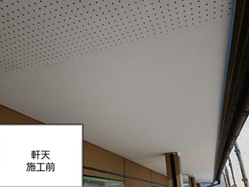 施工前の軒天です。雨風は当たりませんが、湿気により変色している箇所が見られます。