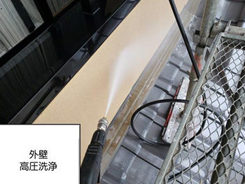 施工中の外壁です。最初に高圧洗浄で汚れを落とします。