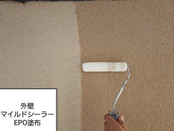施工中の外壁です。マイルドシーラーEPO塗料で、経年劣化した外壁を補強しました。