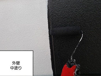 中塗り後、外壁上塗りの様子です。丁寧に塗り重ねます。